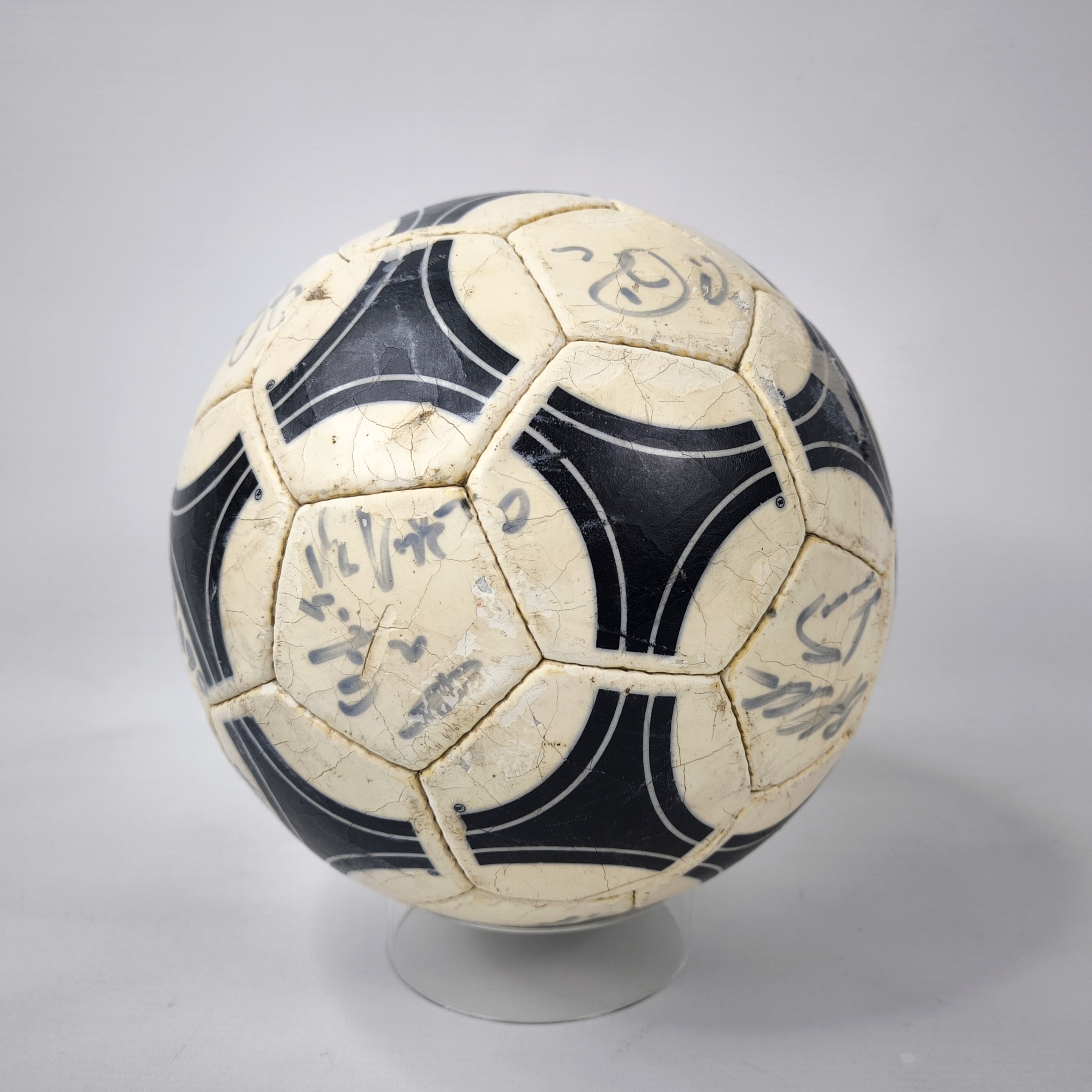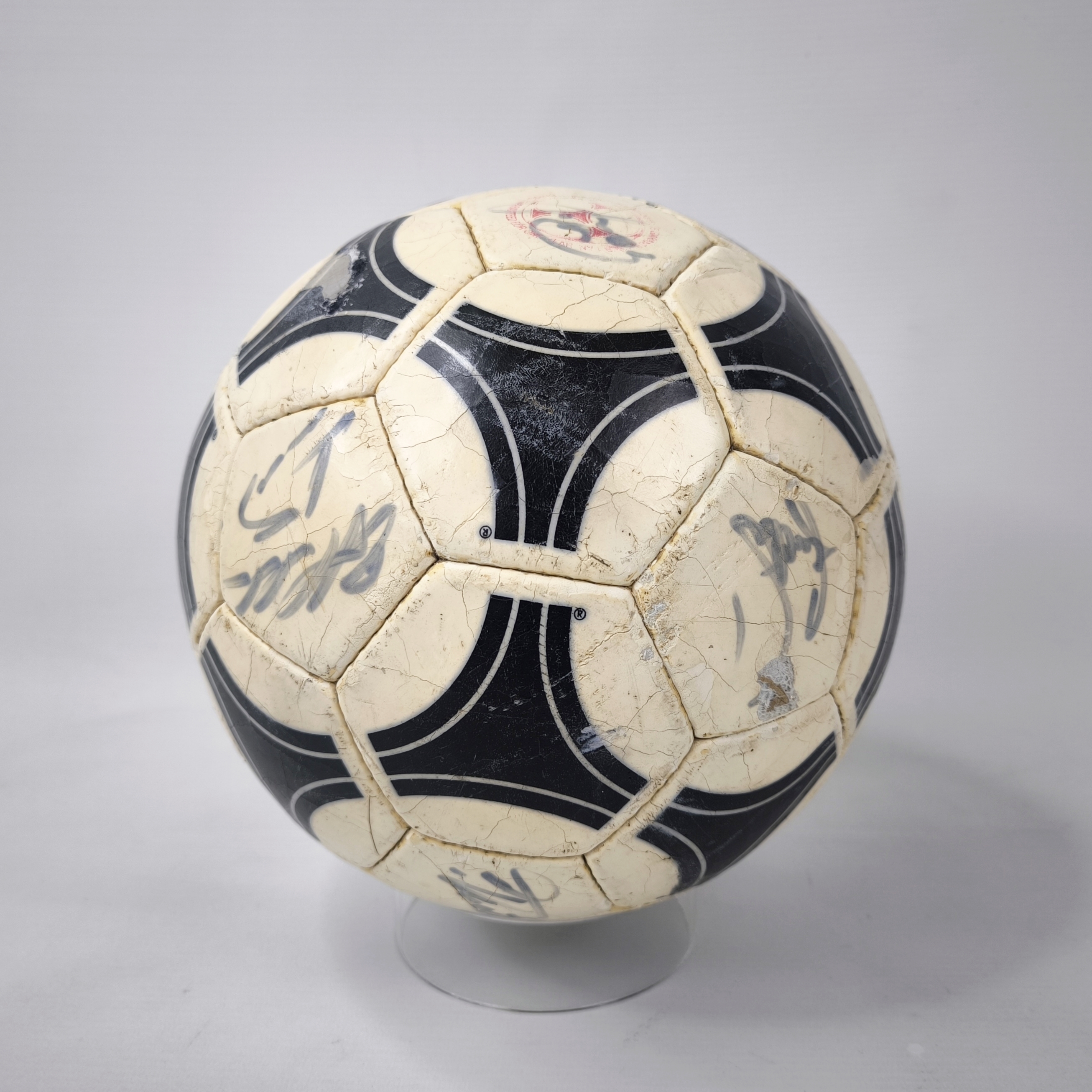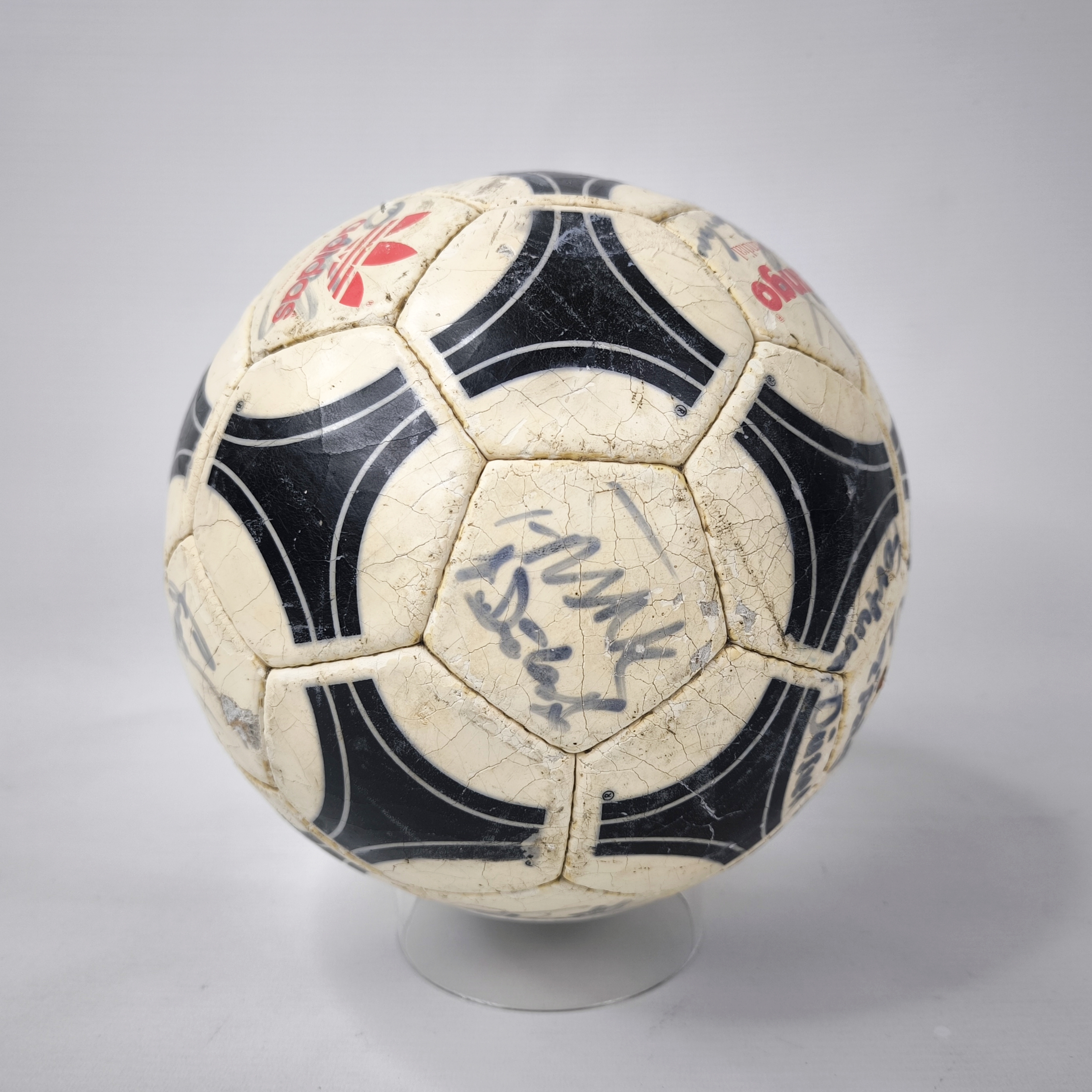 ________________________________________Marke: adidasModell: WM 82Größe: 5Zustand: unbespielt________________________________________Beschreibung:adidas Fussball WM 82.Unbespielter und neuer Ball.Signiert ist er von der deutschen Fussball Nationalmannschaft 1982.Der Fußball ist optisch das Modell Chile Durlast, wie er original zur WM 1974 und zur EM 1976 benutzt wurden.Unterschrieben haben unter anderem:Trainer Jupp Derwall, Lothar Matthäus, Karl-Heinz Rummenigge, Bernd Franke, Toni Schumacher, Felix Magath, Horst Hrubesch und Pierre Littbarski.Auf Grund des Alters läßt er sich nicht mehr aufpumpen und die Blase ist leicht hörbar im Ball.Der Ball hat seine runde Form aber absolut beibehalten.Toller und seltener Fussball aus dem Jahr 1982 und original signiert.