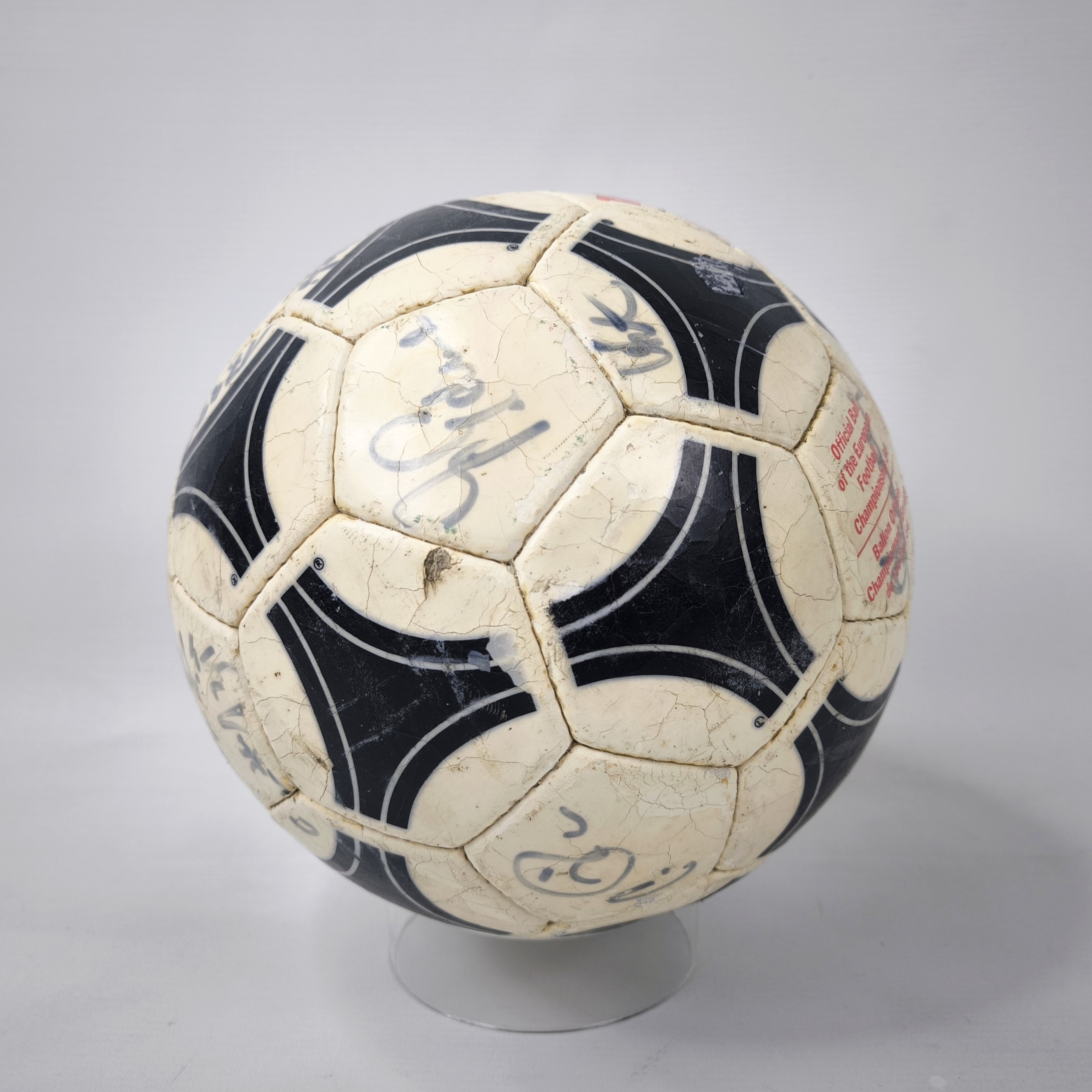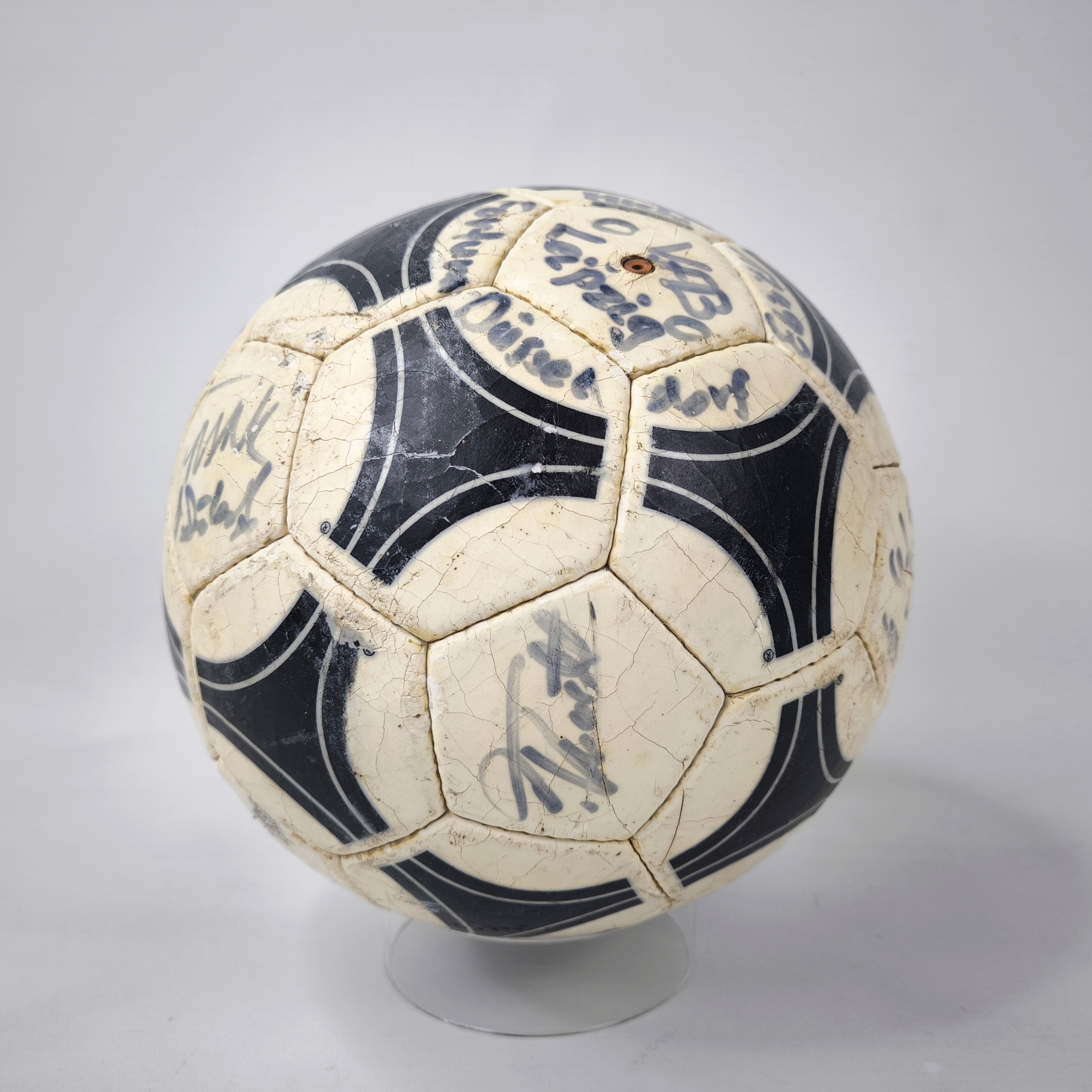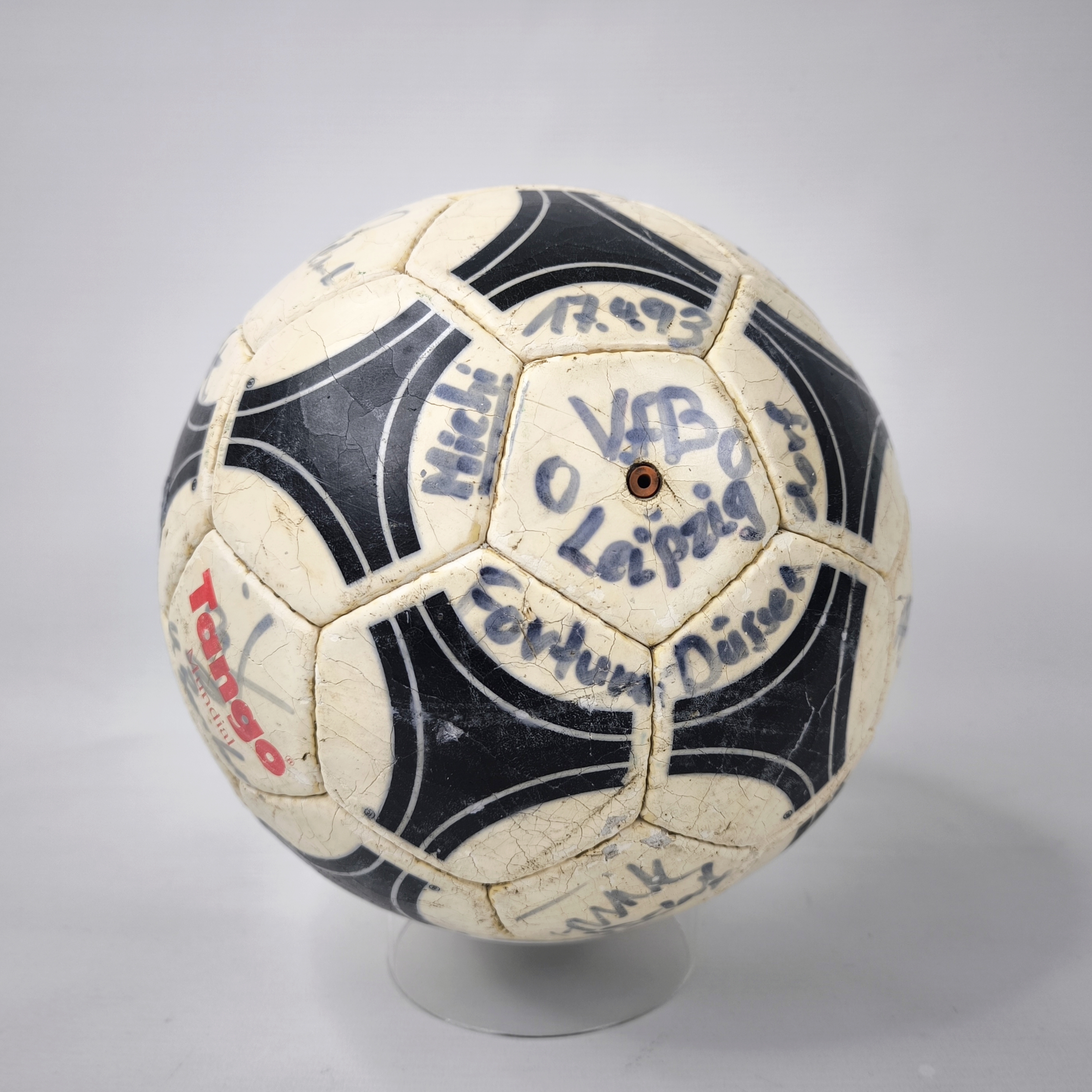 ______________________________________ Marke: adidasModell: Tango ComoGröße: 5Zustand: neu ______________________________________ Beschreibung:adidas Fussball Tango Como ca. aus dem Jahr 1990.Lässt sich aufpumpen und hält die Luft kurz.Nach einiger Zeit entweicht die Luft aber wieder aus dem Ball.Absolut perfekte runde Form auch ohne Luft !Der Ball wurde nicht bespielt.Unbenutzt, neu und in einem sehr schönen Zustand.Unterschriften einer unbekannten Mannschaft.