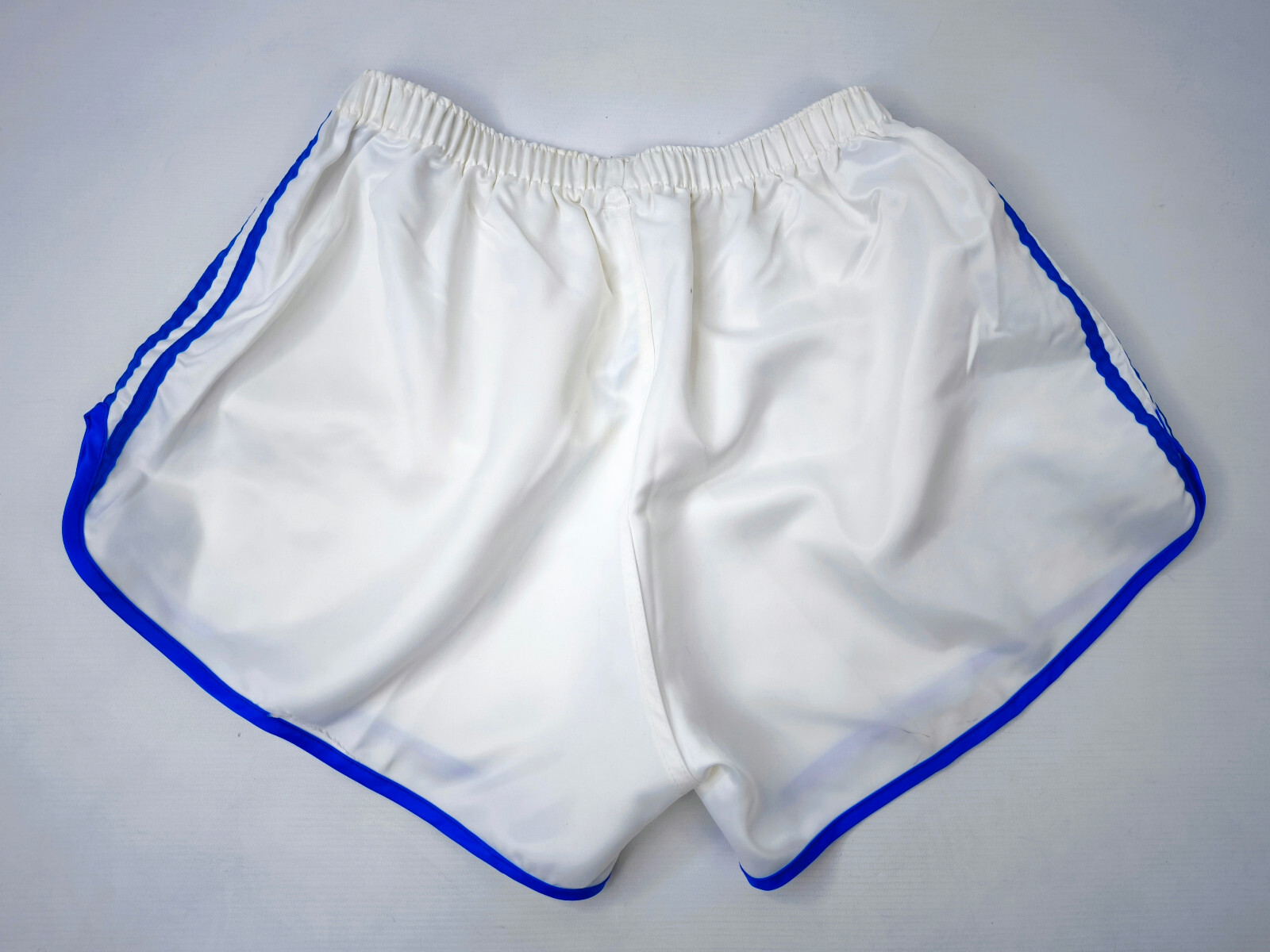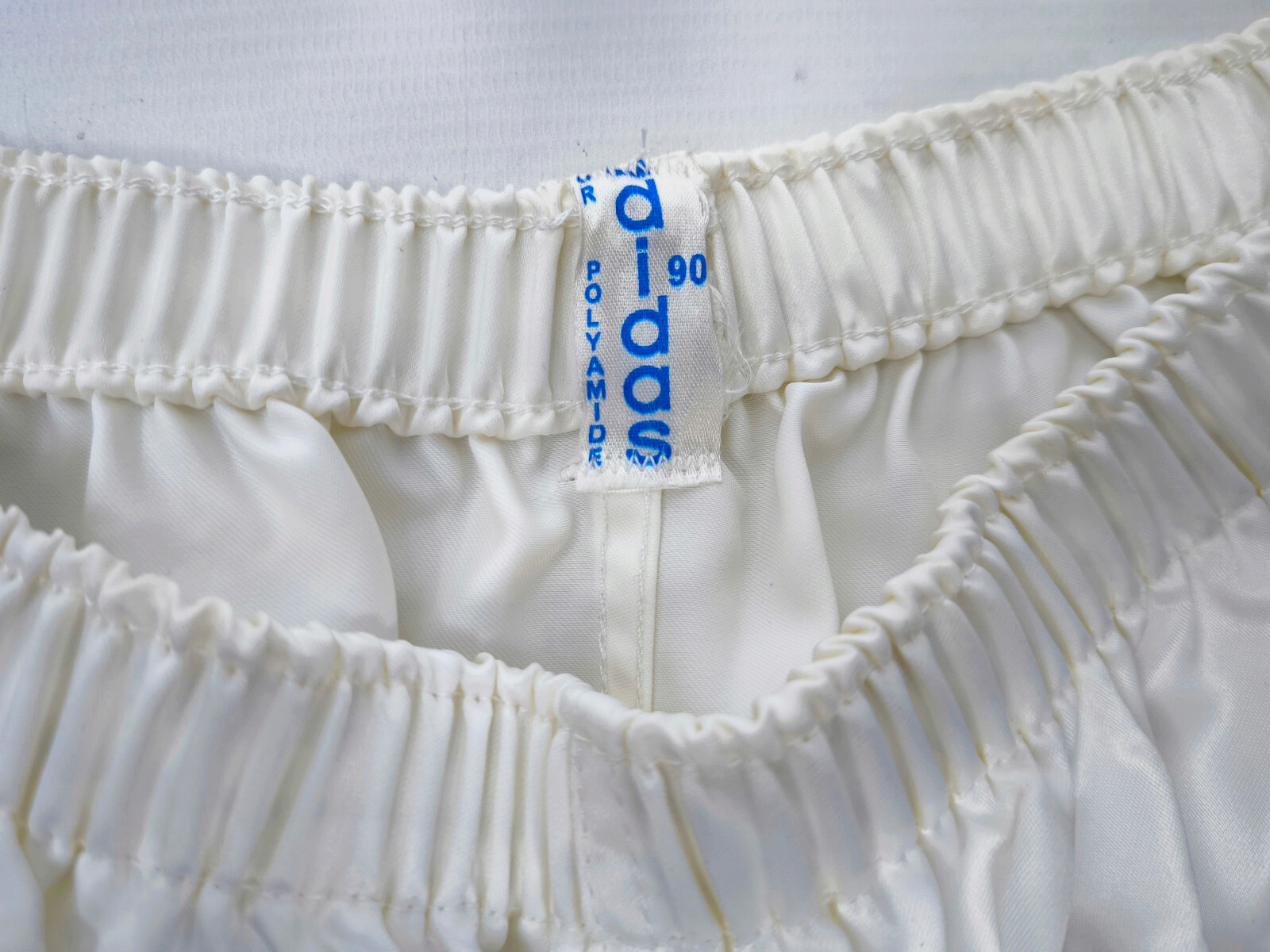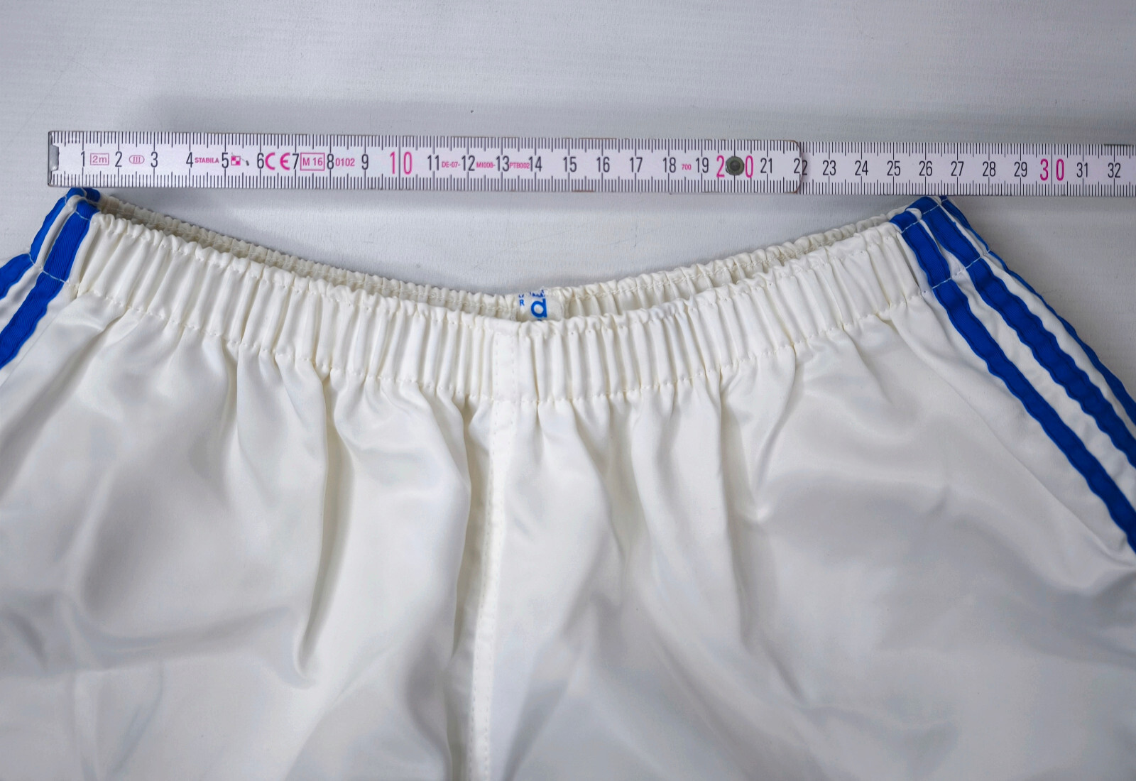 ________________________________________Marke: adidasGröße: LFarbe: weiß / Streifen dunkelblauZustand: neu________________________________________Beschreibung:Die Short ist neu und ungetragen.Altes adidas Modell aus den 1980er / 1990er Jahren ohne Innenslip.In der Short ist die Größe 100 angegeben, was einer Größe L entspricht.Kommt original verpackt im Polybag aus altem Lagerbestand.________________________________________Die ca. Maße sind wie folgt:Ungedehnte Breite: 29cmGedehnte Breite: 39cm(Maßangabe gedehnt, nicht vollständig ausgedehnt sondern immer noch mit Luft).________________________________________Material:100% Polyamid (Nylon)________________________________________Pflegeanleitung:Maschinenwäsche 30 Grad
