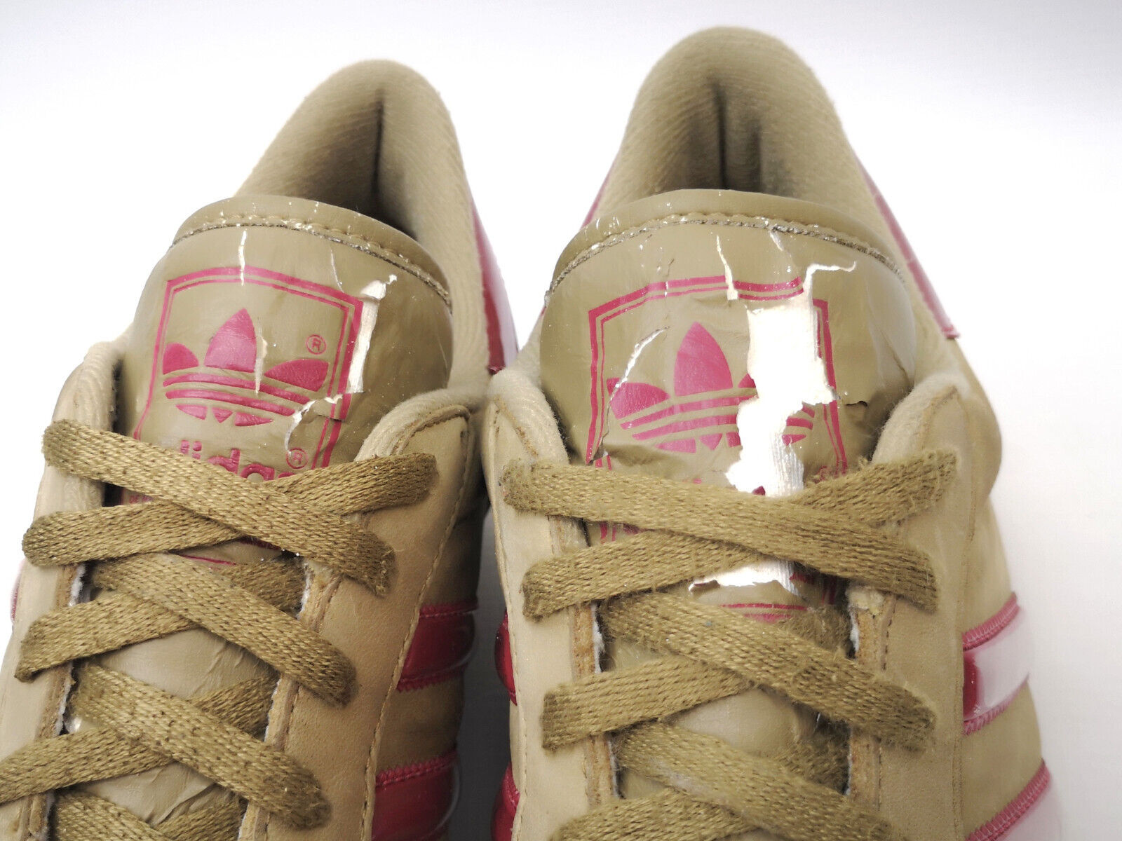 Der Kleber an der Zunge, unter den Schnürsenkeln am adidas Logo, verliert seine Haftung und das obere Teil der Zunge mit dem adidas Logo wird rissig, porös und blättert was voraussichtlich fortschreiten wird.