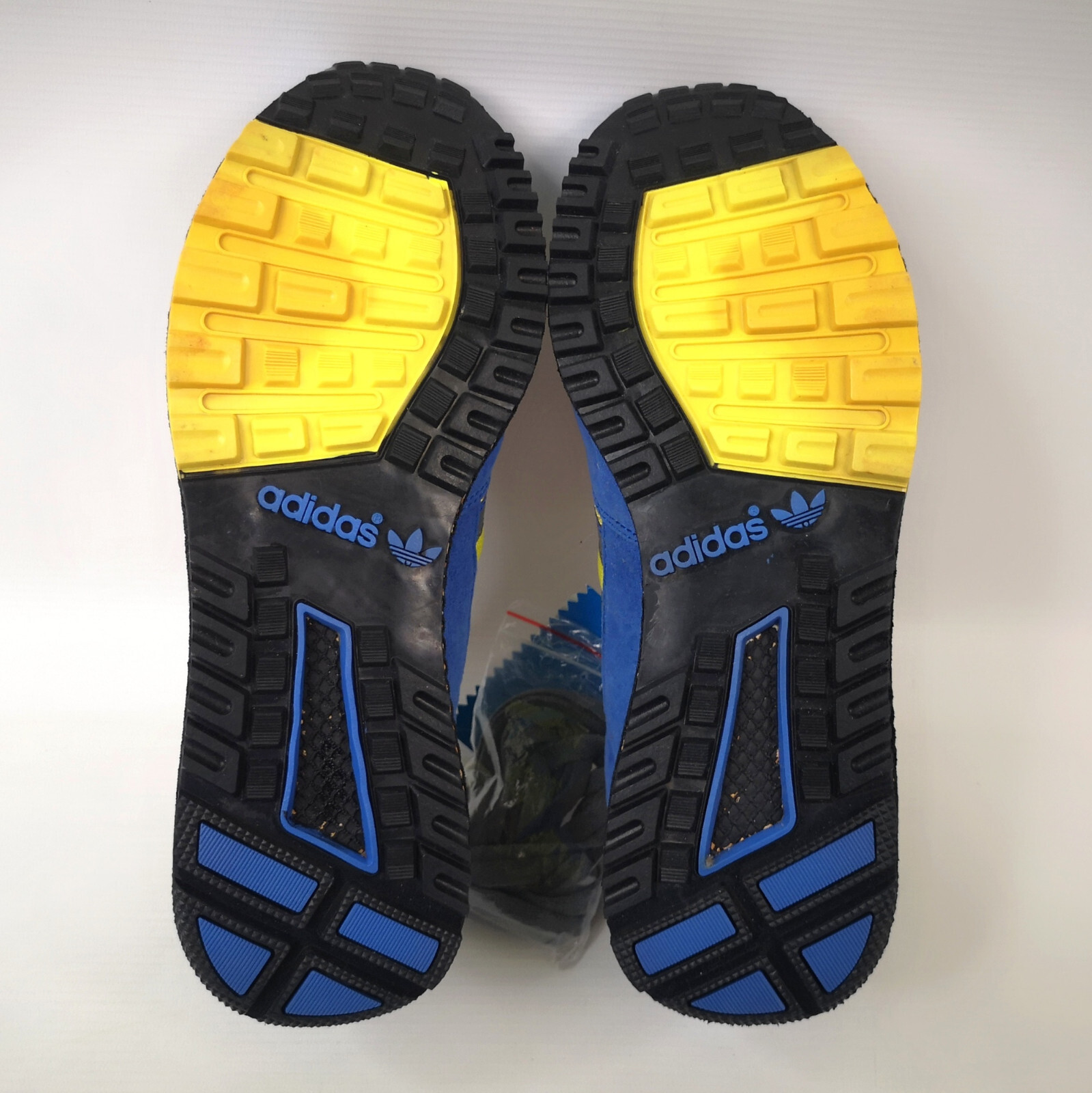 Leichte Farbveränderung durch das Alter an beiden unteren Sohlen und dem gelben Streifen umlaufend am unteren Hacken.