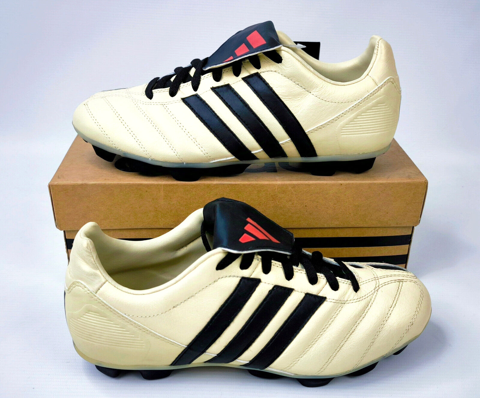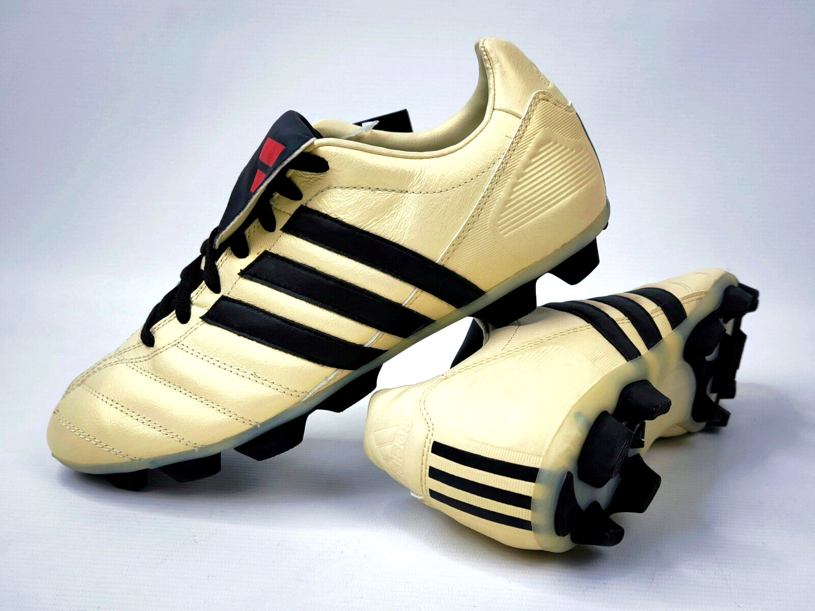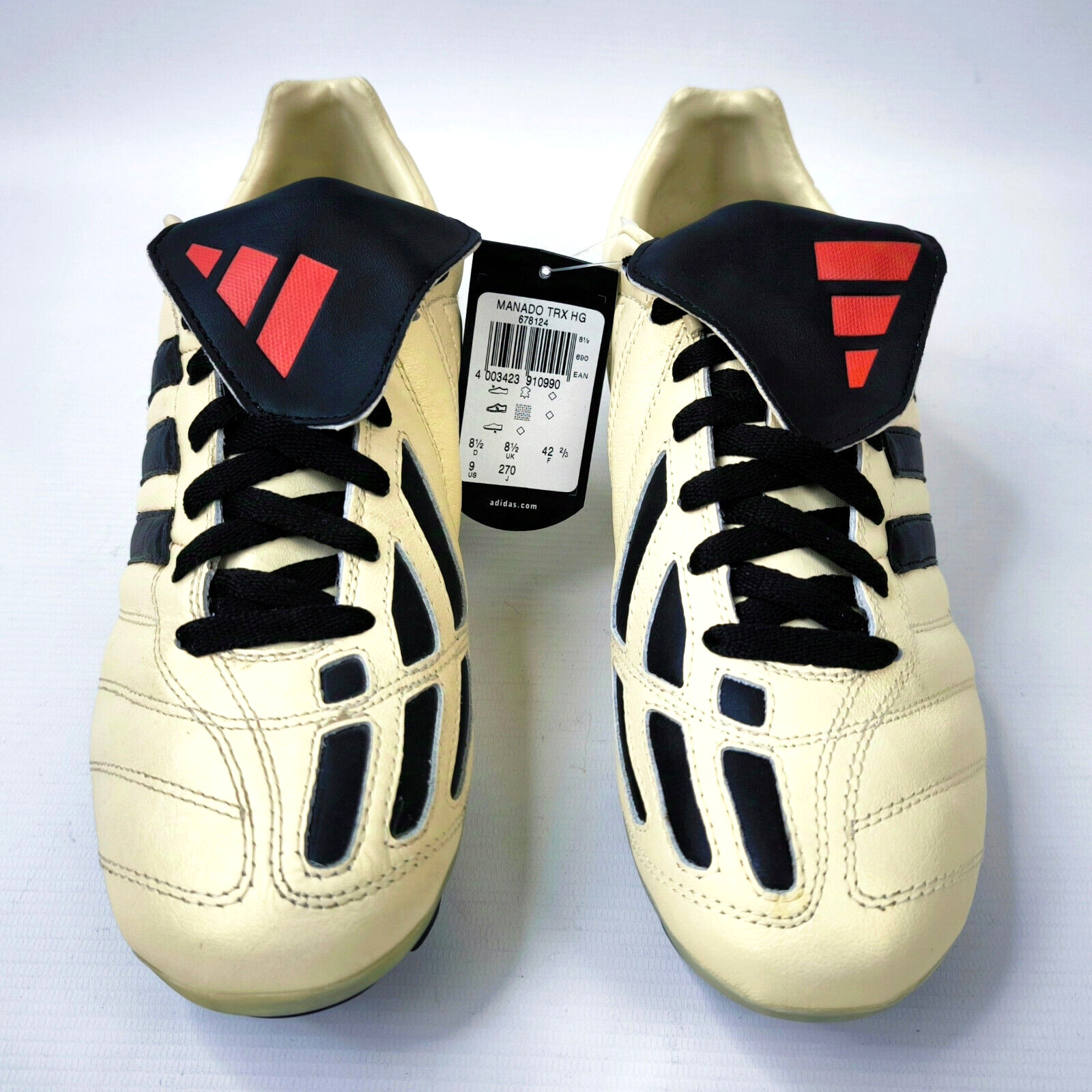 ________________________________________Marke: adidasModell: Manado TRX FG Art.-Nr.: 042096Größe: Eur 48 / UK 12.5 / US 13Farbe: creme / schwarz / rot Zustand: neu _______________________________________Beschreibung:Die Schuhe sind neu und ungetragen.Durch die Lagerung und das hohe Alter sind die Laschen unter den Schnürsenkeln etwas rissig geworden.Toller adidas Manado aus dem Jahr 2003.Ungetragen.