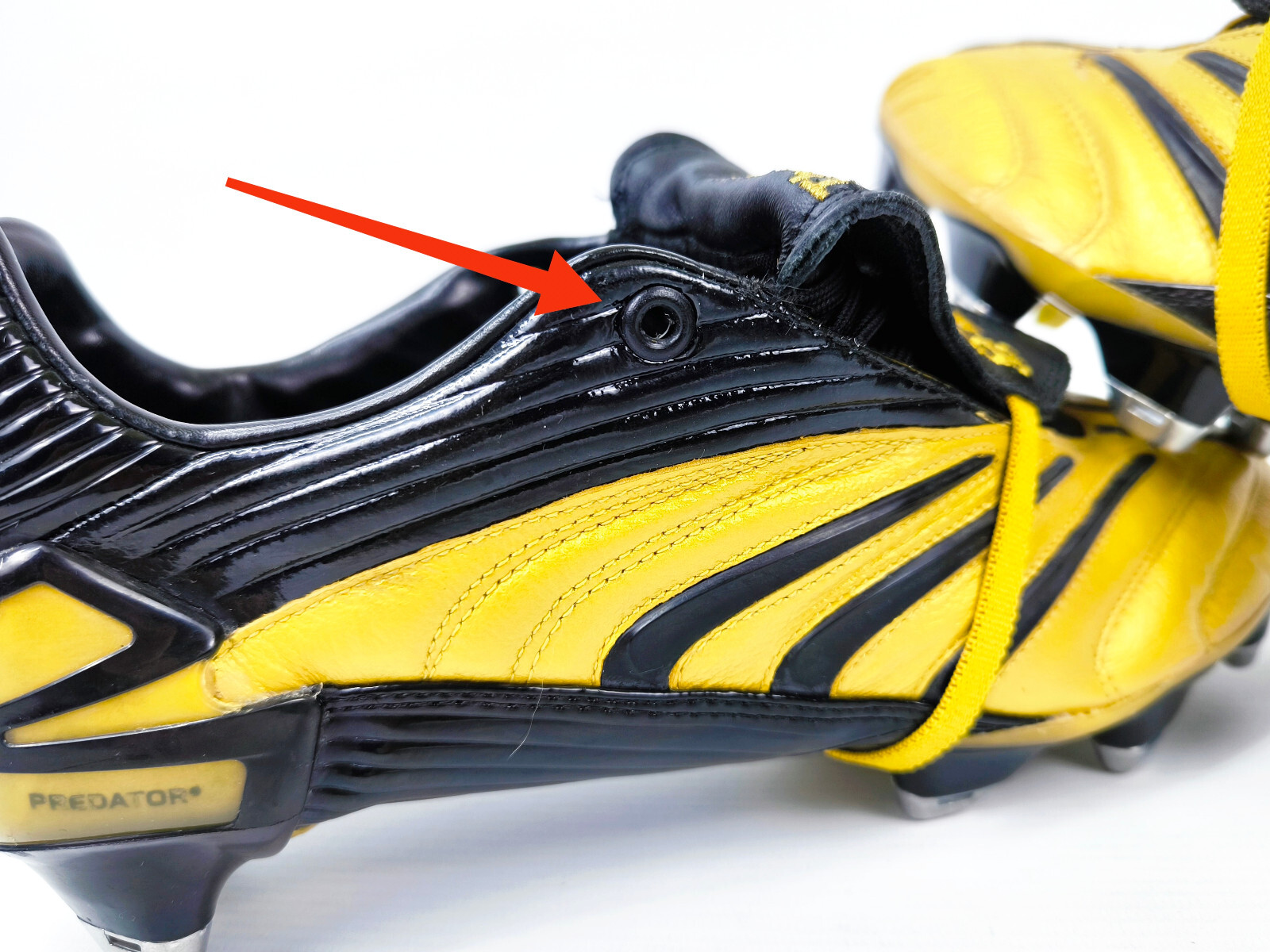 Metallöse für die Schnürung an beiden Schuhen eigens für ihn hergestellt (siehe Foto mit rotem Pfeil)