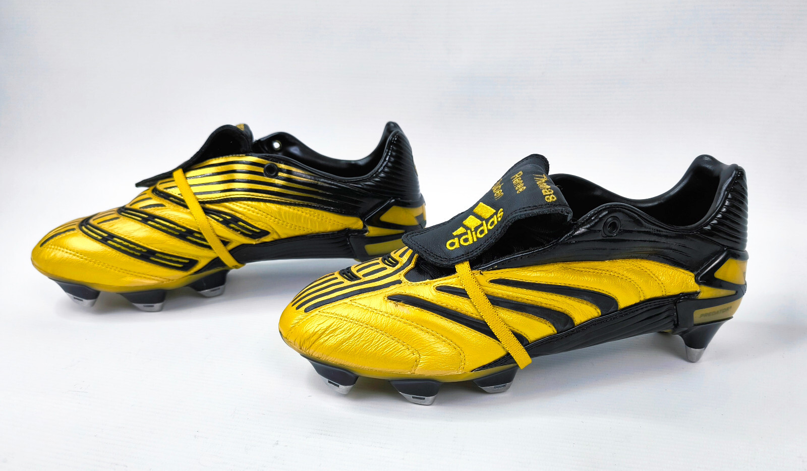 ________________________________________Marke: adidasModell: Predator Precision / ManiaModell: Prototype / SampleSpieler: Michael BallackVerein: Bayer LeverkusenGröße: Eur 42 2/3 / UK 8.5 / US 9Farbe: schwarz / rot / weißZustand: match worn / vom Spieler getragen________________________________________Beschreibung:Match Worn / getragen von Michael Ballack in der Saison 2001/2002.Hierbei handelt es sich um ein Predator Prototype.Vereint ist hier der Predator Precision und der Predator Mania, bevor der Predator Mania 2002 dann final in den Verkauf ging.- Hier sind die Precision Streifen über den Mania Streifen genäht- weiße Farbe auf der Sohle, damit Optik der Precision bewahrt wird- schwarze Kappe an der Ferse- schwarze Gummilamellen im vorderen BereichEin Predator Prototype für Michael Ballack.Beide Schuhe an den Laschen handschriftlich von ihm unterschrieben.Im linken Schuh ist das Größenetikett vorhanden.Schuhe zeigen natürlich starke Spielspuren.Wurden nicht geputzt oder gesäubert und so belassen wie sie waren.Laschenbender ohne Dehnung.Ein fantastische Paar Fußballschuhe eines einzigartigen Fußball-Spielers.Absolutes Unikat !Aus der Saison 2001/02, wo Bayer Leverkusen im Finale der Champions League 2002 gegen Real Madrid leider 1:2 unterlag.