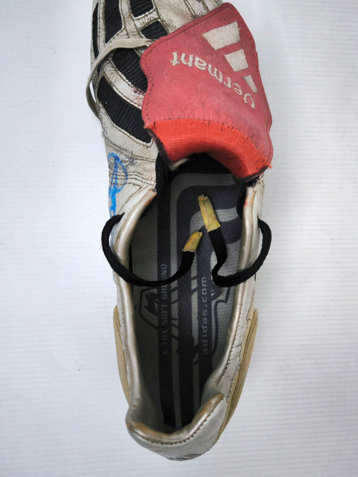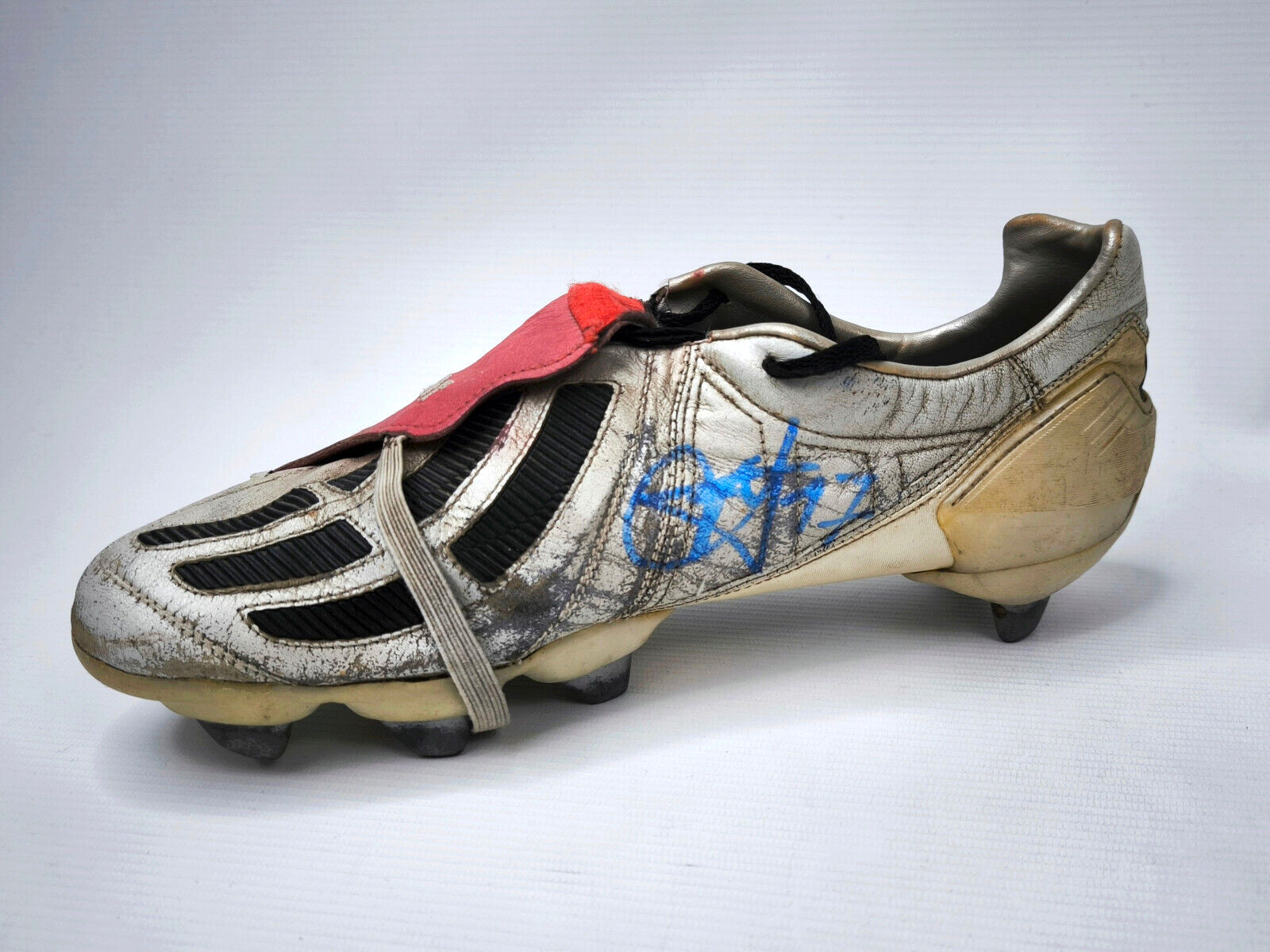 ________________________________________Marke: adidasModell: Predator Precision / ManiaModell: Prototype / SampleSpieler: Michael BallackVerein: Bayer LeverkusenGröße: Eur 42 2/3 / UK 8.5 / US 9Farbe: schwarz / rot / weißZustand: match worn / vom Spieler getragen________________________________________Beschreibung:Match Worn / getragen von Michael Ballack in der Saison 2001/2002.Hierbei handelt es sich um ein Predator Prototype.Vereint ist hier der Predator Precision und der Predator Mania, bevor der Predator Mania 2002 dann final in den Verkauf ging.- Hier sind die Precision Streifen über den Mania Streifen genäht- weiße Farbe auf der Sohle, damit Optik der Precision bewahrt wird- schwarze Kappe an der Ferse- schwarze Gummilamellen im vorderen BereichEin Predator Prototype für Michael Ballack.Beide Schuhe an den Laschen handschriftlich von ihm unterschrieben.Im linken Schuh ist das Größenetikett vorhanden.Schuhe zeigen natürlich starke Spielspuren.Wurden nicht geputzt oder gesäubert und so belassen wie sie waren.Laschenbender ohne Dehnung.Ein fantastische Paar Fußballschuhe eines einzigartigen Fußball-Spielers.Absolutes Unikat !Aus der Saison 2001/02, wo Bayer Leverkusen im Finale der Champions League 2002 gegen Real Madrid leider 1:2 unterlag.