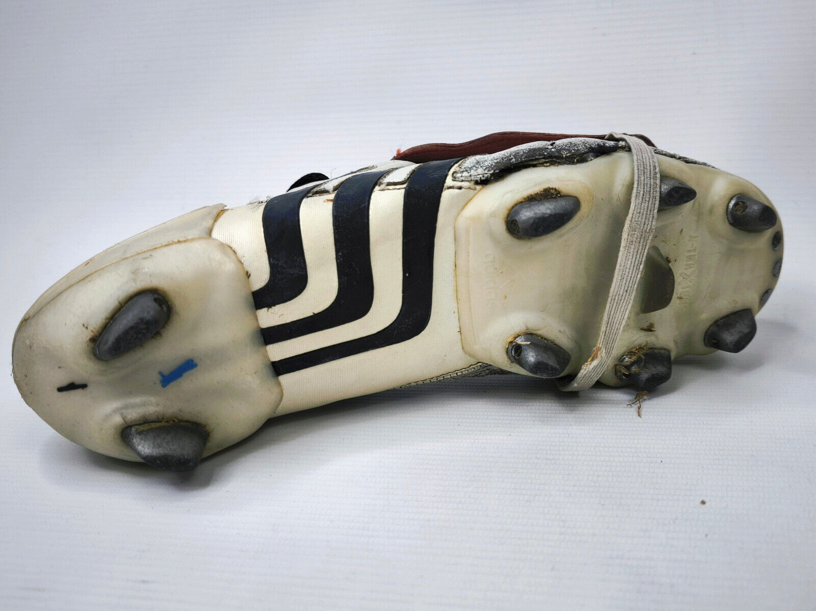 Der Schuh hat starke Spielspuren und außen auch eine Beschädigung im Leder.