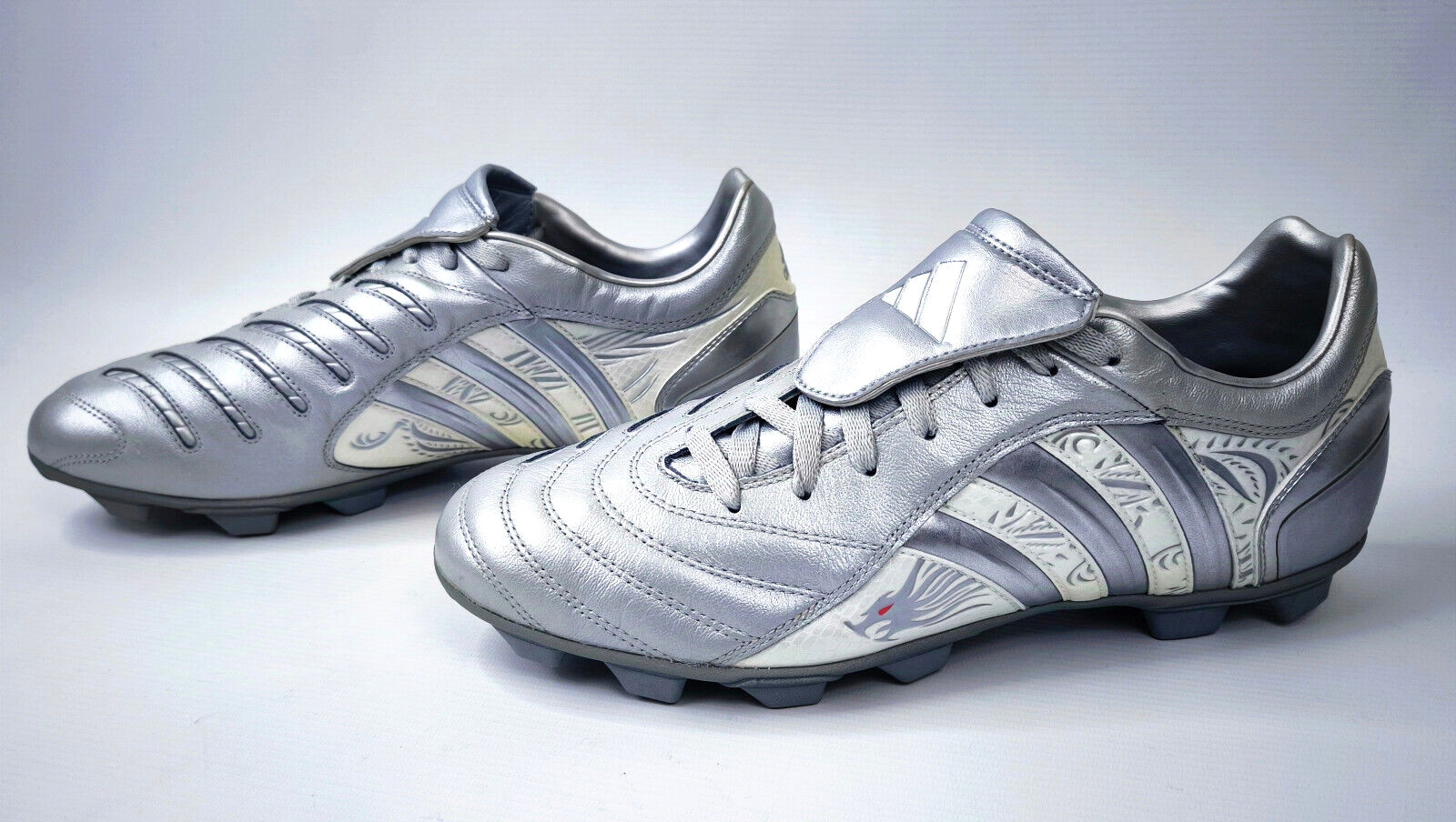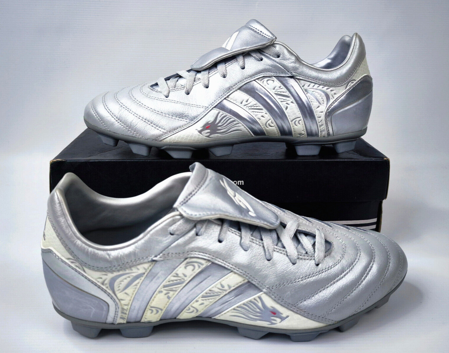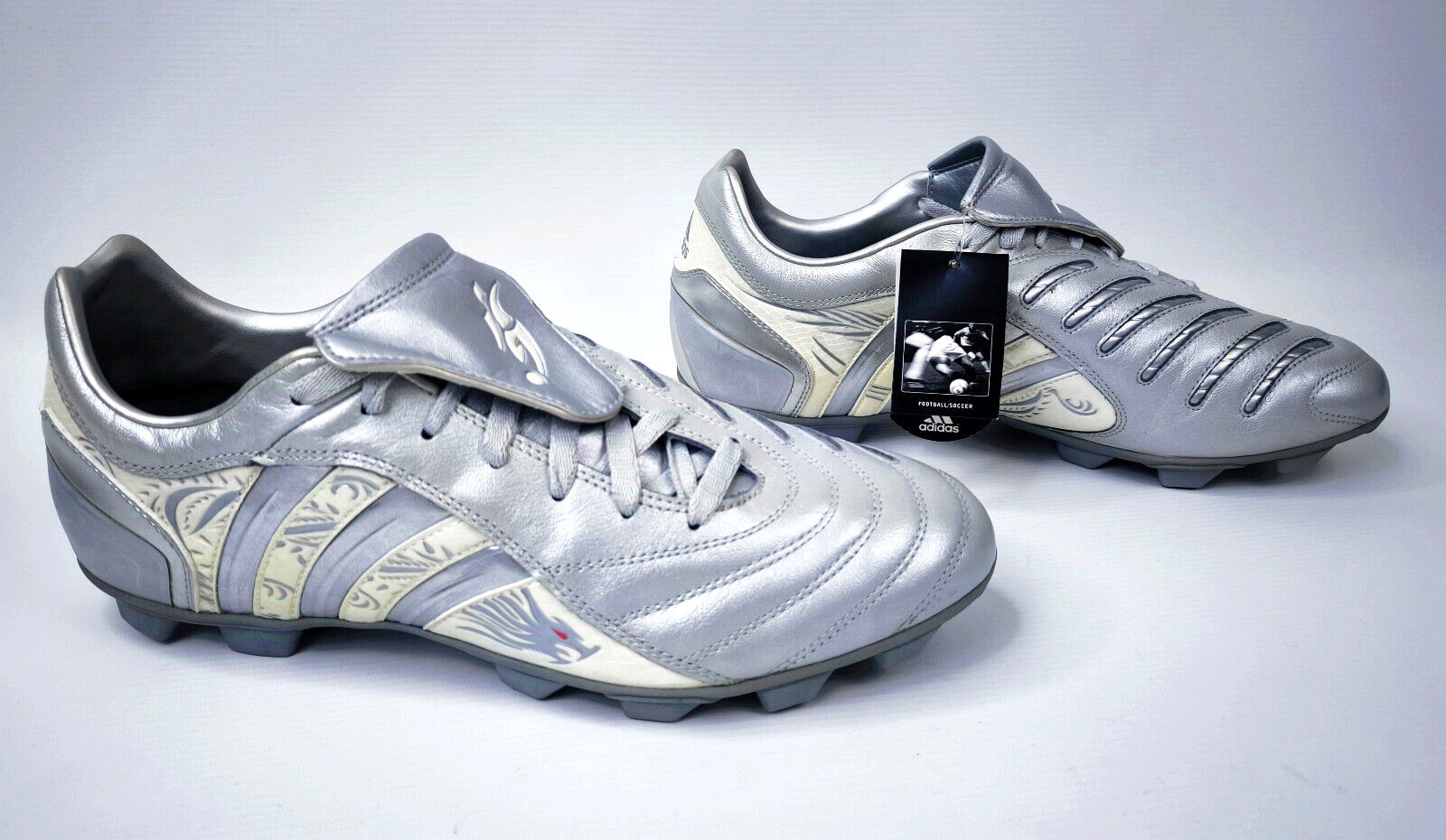 ________________________________________Marke: adidasModell: Pulsado TF / 553400Größe: UK 7 / US 7.5 / Eur 40 2/3Farbe: silber / beige Zustand: neu________________________________________Beschreibung:Die Schuhe sind ungetragen.Durch das Alter und die lange Lagerung sind die Laschen vom Material her brüchig geworden und blättern leicht ab.Ein Predator Pulsado TF aus dem Jahr 2004.Aus der Predator Serie von David Beckham.Ungetragen mit leichten Lagerschäden.________________________________________Obermaterial:100% Leder / SyntheticSohle:100% Gummi