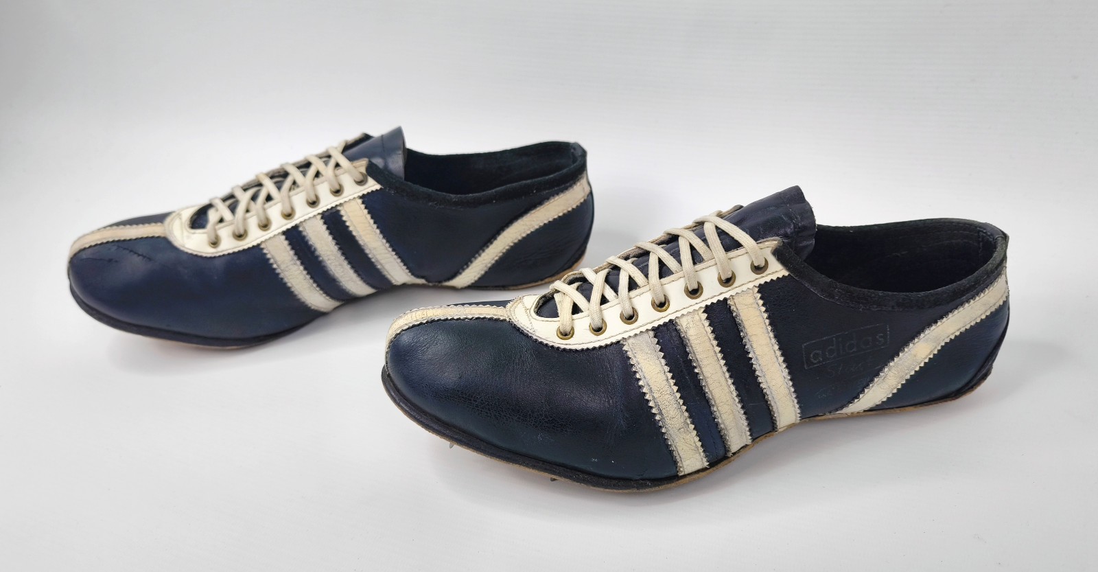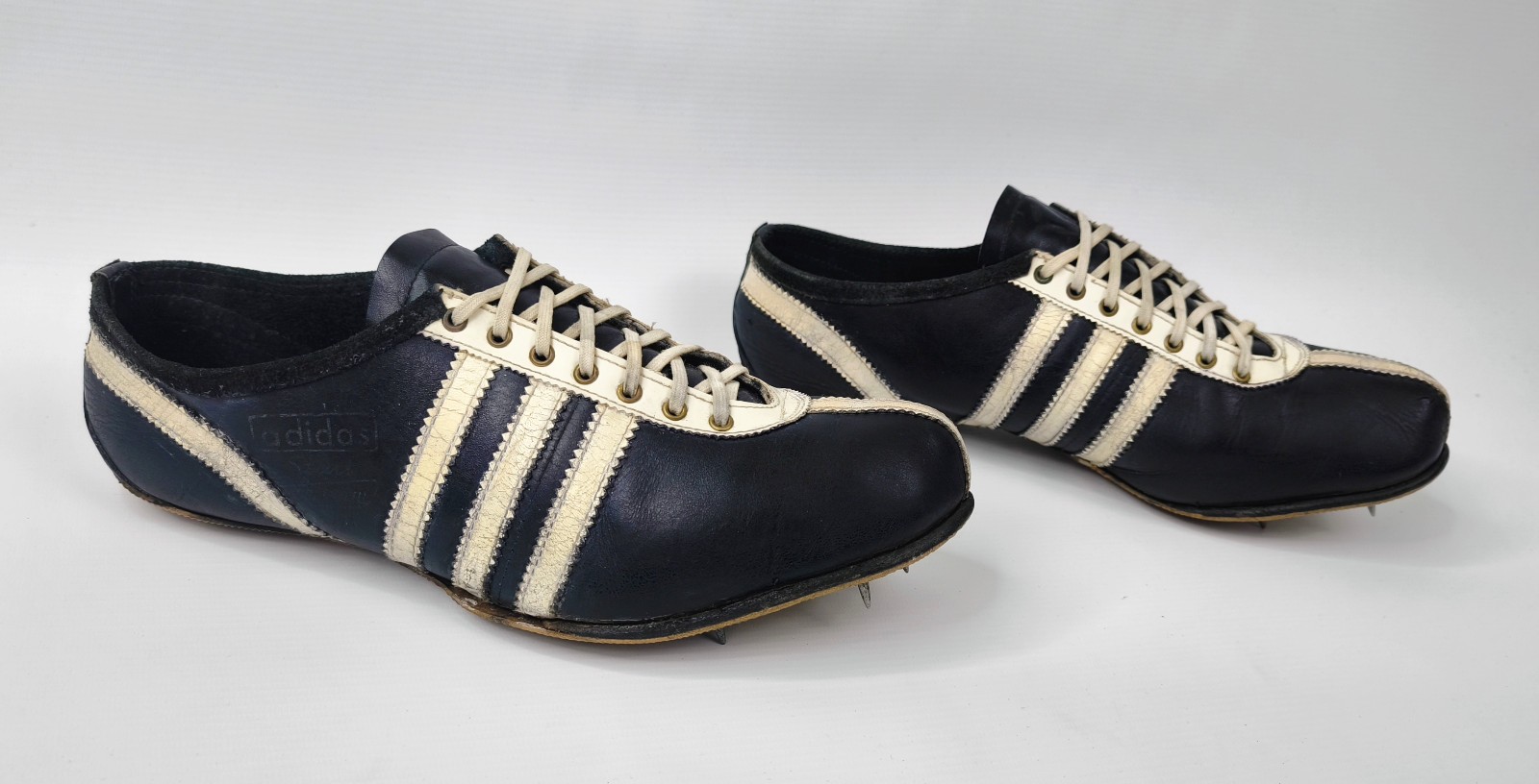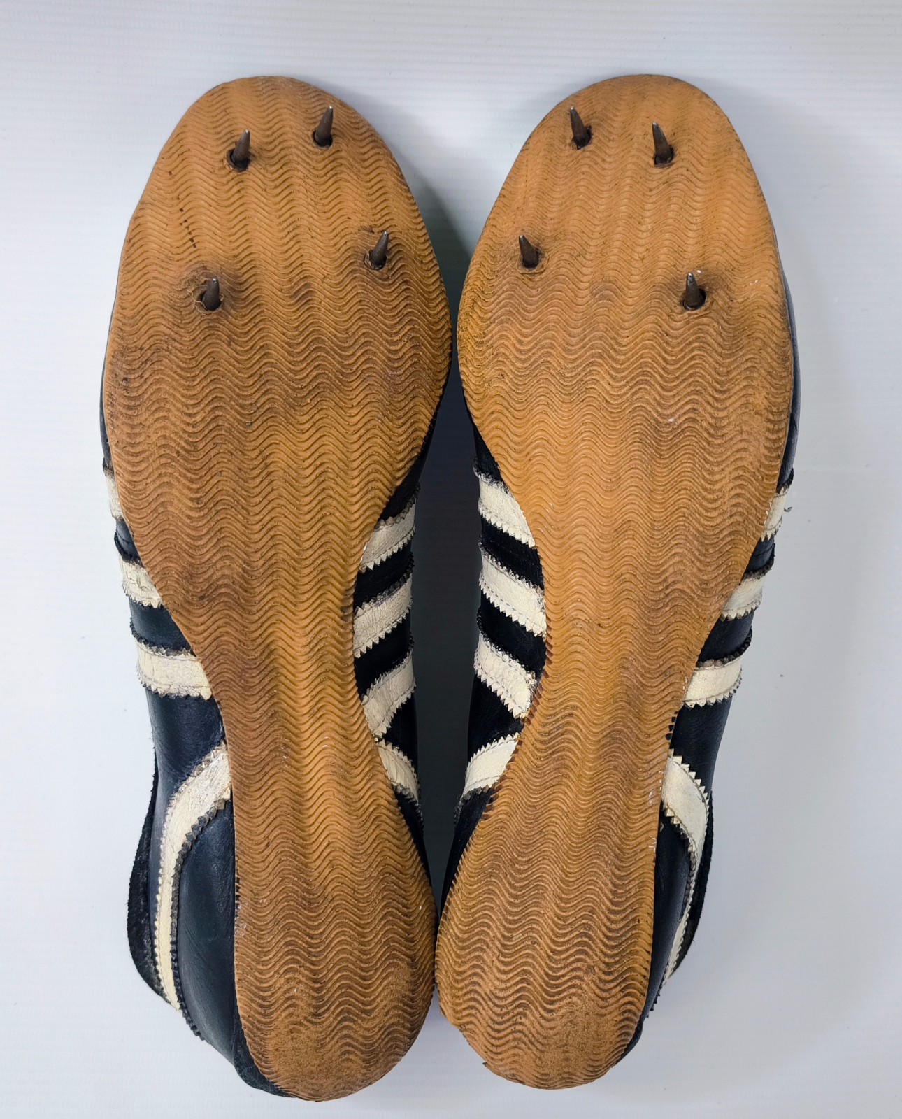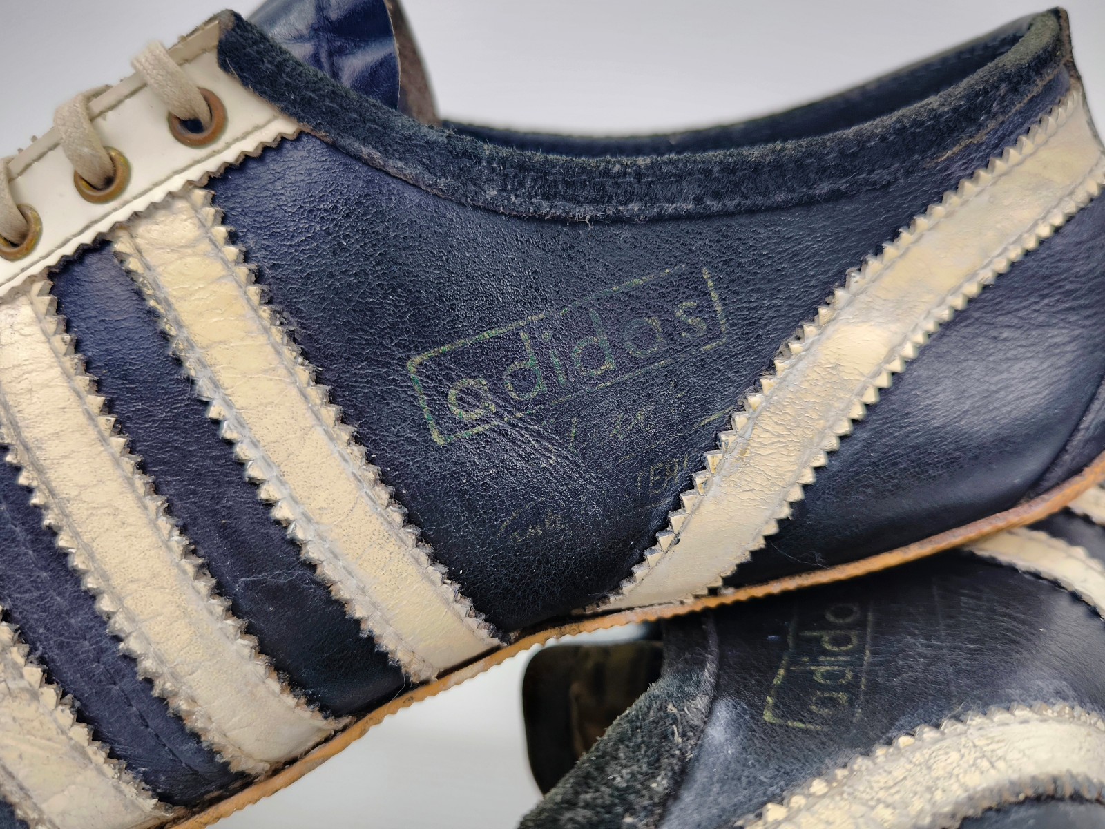 Beide adidas Label-Einnäher der 1950er Jahre sind in den inneren Laschen vorhanden (siehe Foto).Ein adidas Spike Schuh original aus den 1950er Jahren.