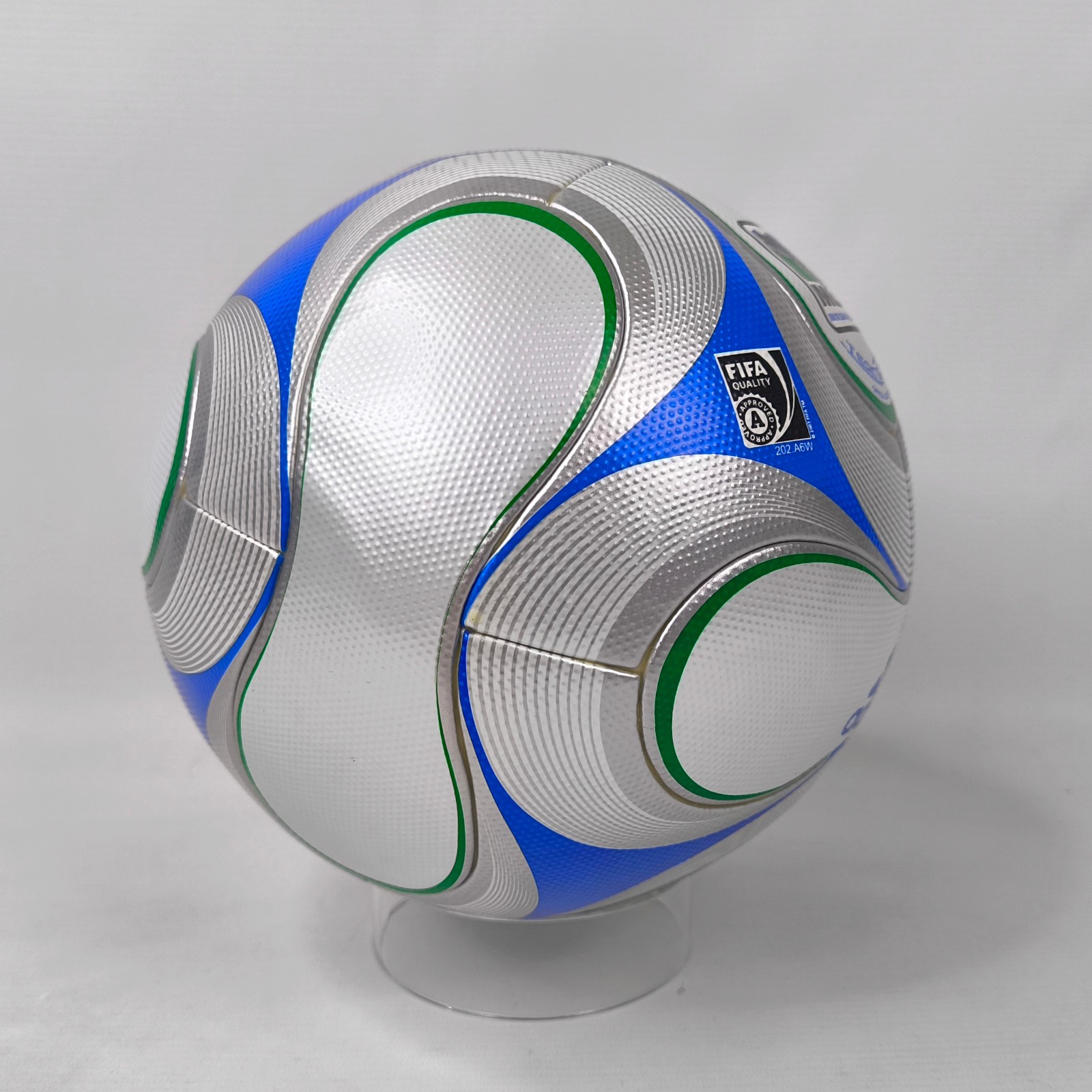 ________________________________________Marke: adidasModell: PeliasTurnier: Confederations Cup 2005Größe: 5Zustand: unbespielt________________________________________Beschreibung:adidas Fussball Pelias.Official Match Ball / Offizieller Spielball des Confederations Cup 2005.Hält die Luft perfekt !An einem Paneel (Foto 3) ist eine Druckstelle und an einem eine leichte Farbveränderung (Foto 9).Der Ball ist aber absolut unbespielt.Kam seinerzeit direkt vom FCB München.
