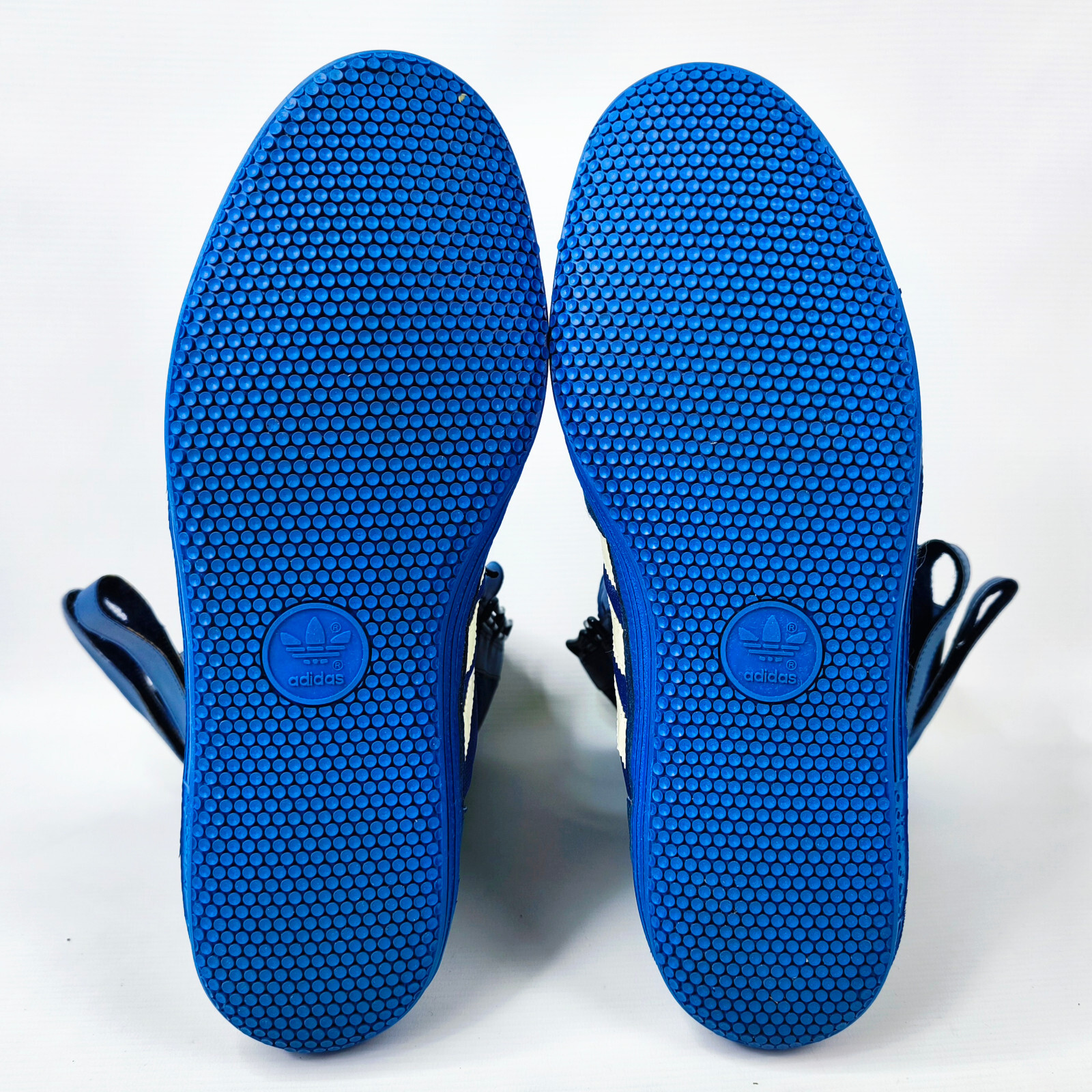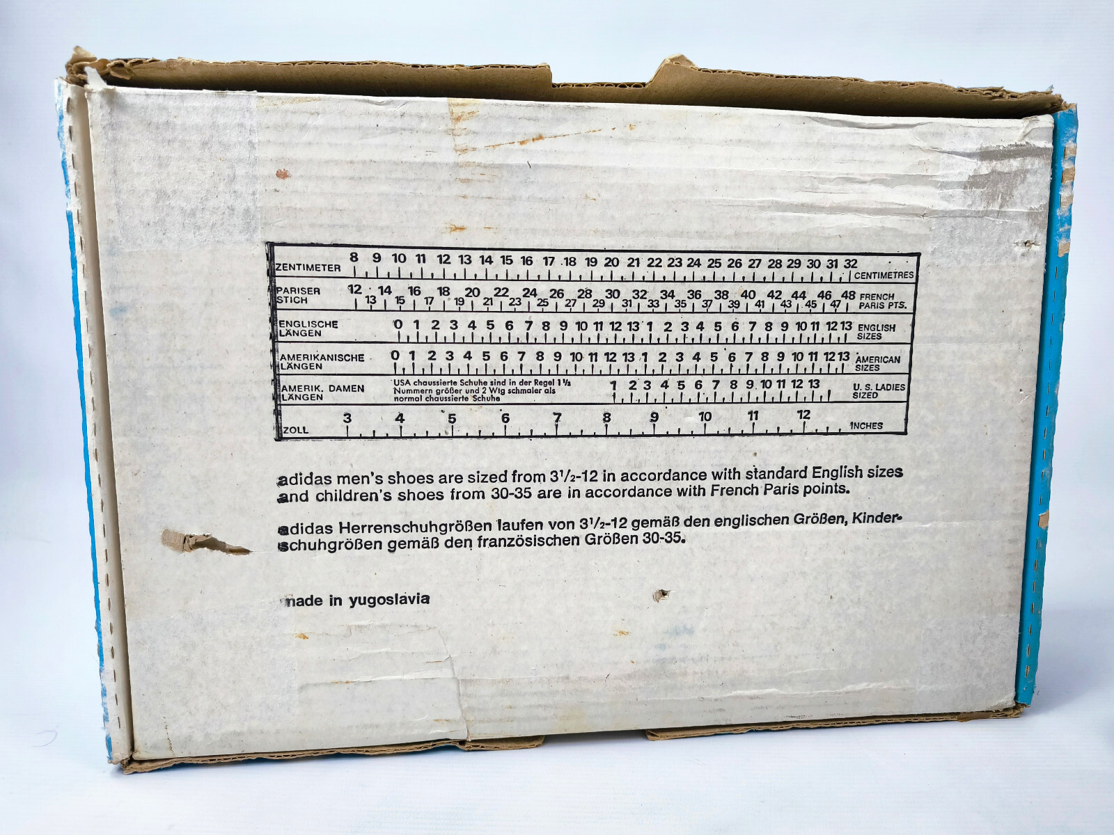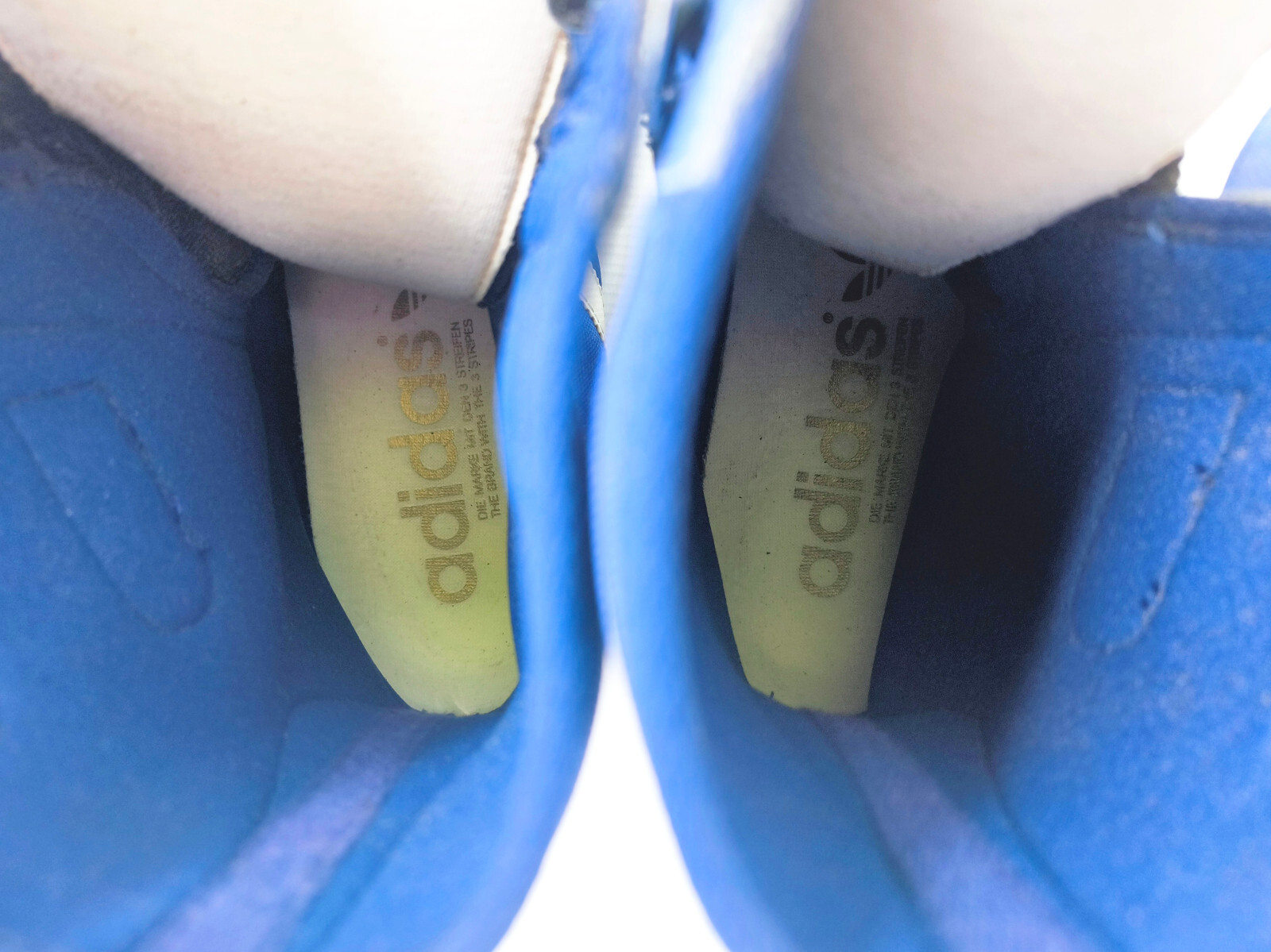 Leichte Spuren der langen Lagerung am linken Schuh des mittleren adidas Streifen.